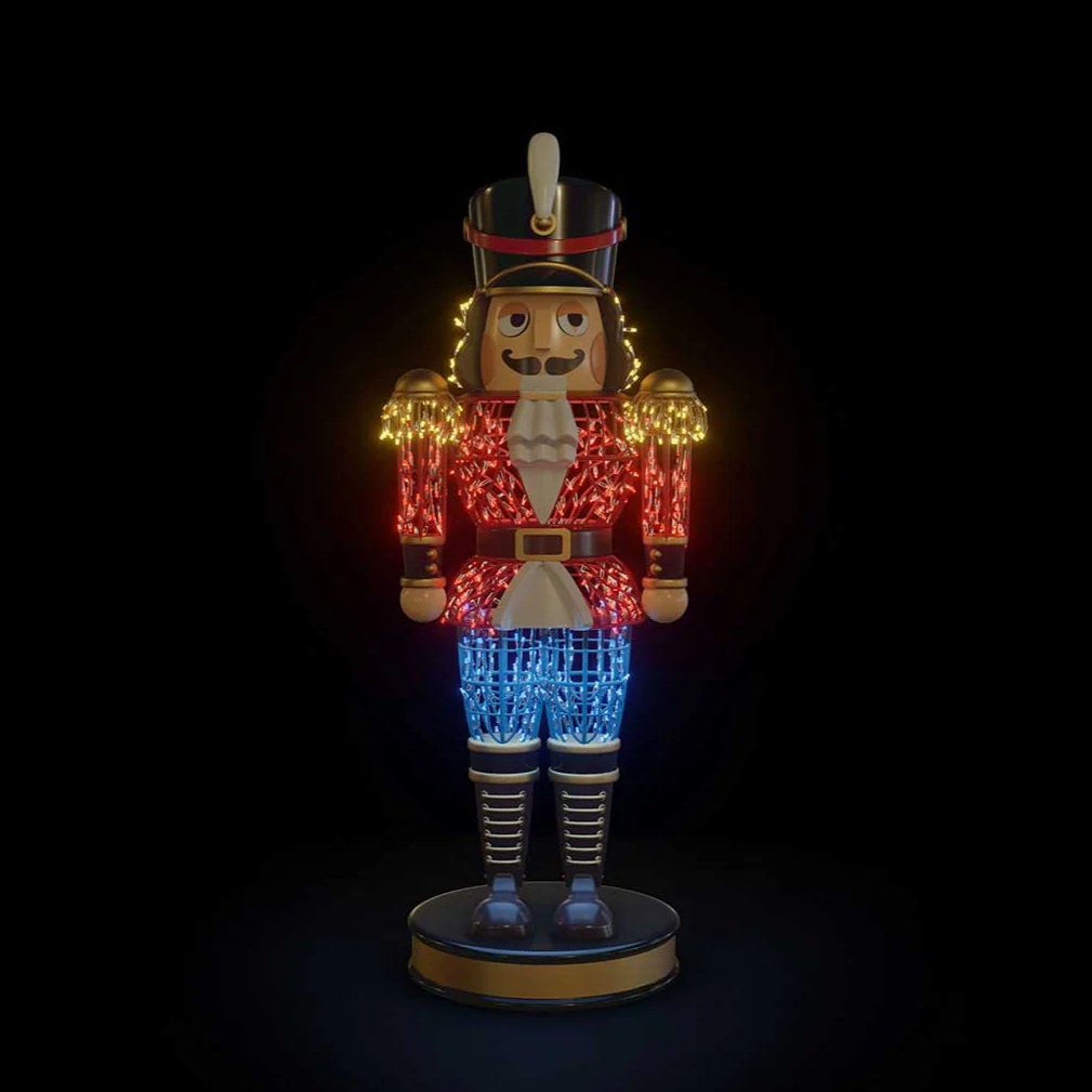 Standing tall in festive splendor, this large illuminated nutcracker radiates timeless charm and classic elegance. Brilliantly lit in a vibrant combination of red, blue, and warm white LEDs, it captures the spirit of holiday tradition with a bold, regal presence. Crafted for durability and built to withstand the elements, this dazzling figure is both striking and resilient—perfect for making a joyful, lasting impression indoors or out.